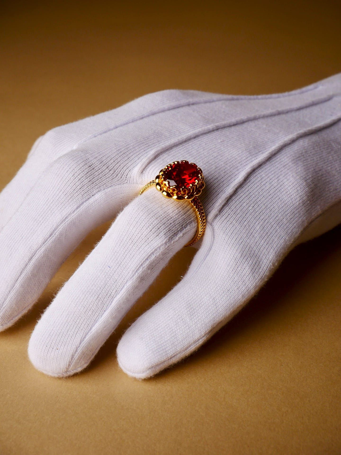 Gemaakt van zilver met 18-karaats verguld goud en voorzien van een dieprode steen met heldere glans.